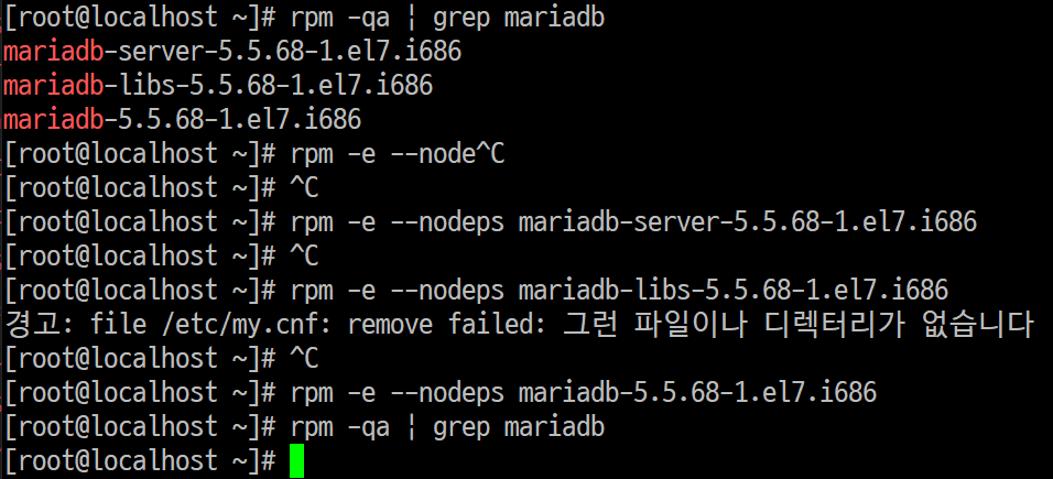 rpm -e --nodeps mariadb-devel-5.5.64-1.el7.x86_64 //예시