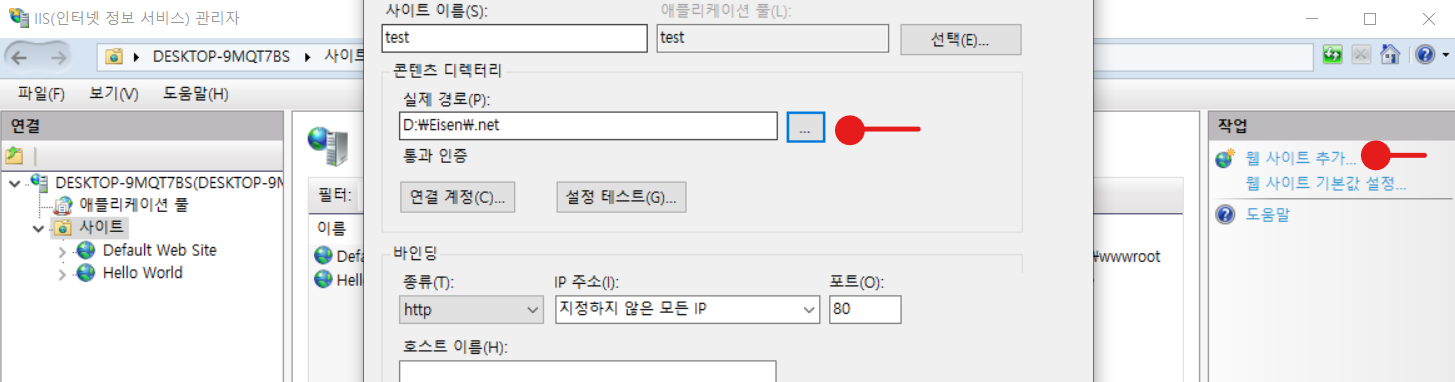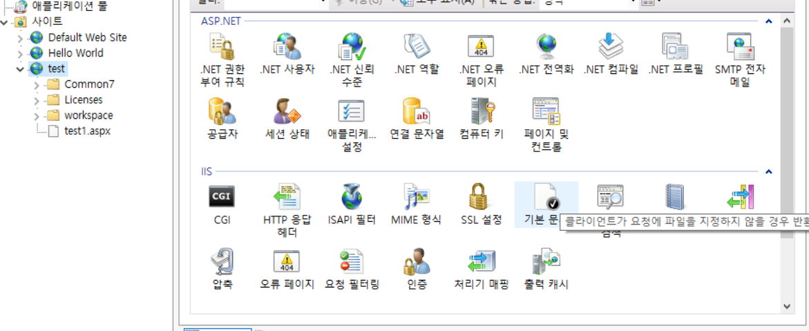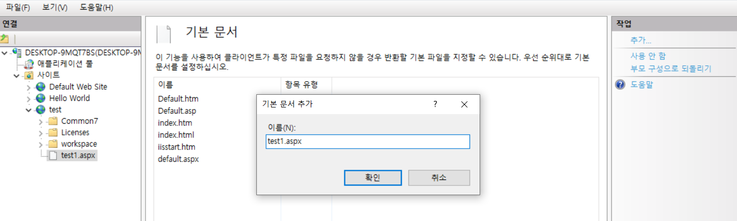 포트 번호를 변경해 주셔야 합니다.(본인이 쓰지 않는 포트번호를 설정합니다. i.e) 80 → 8080)- 기본 문서로 들어갑니다.