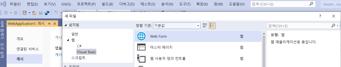 - Visual Studio로 Web Form 파일 생성(Web Form 파일이 aspx 확장자를 갖는 파일입니다.)