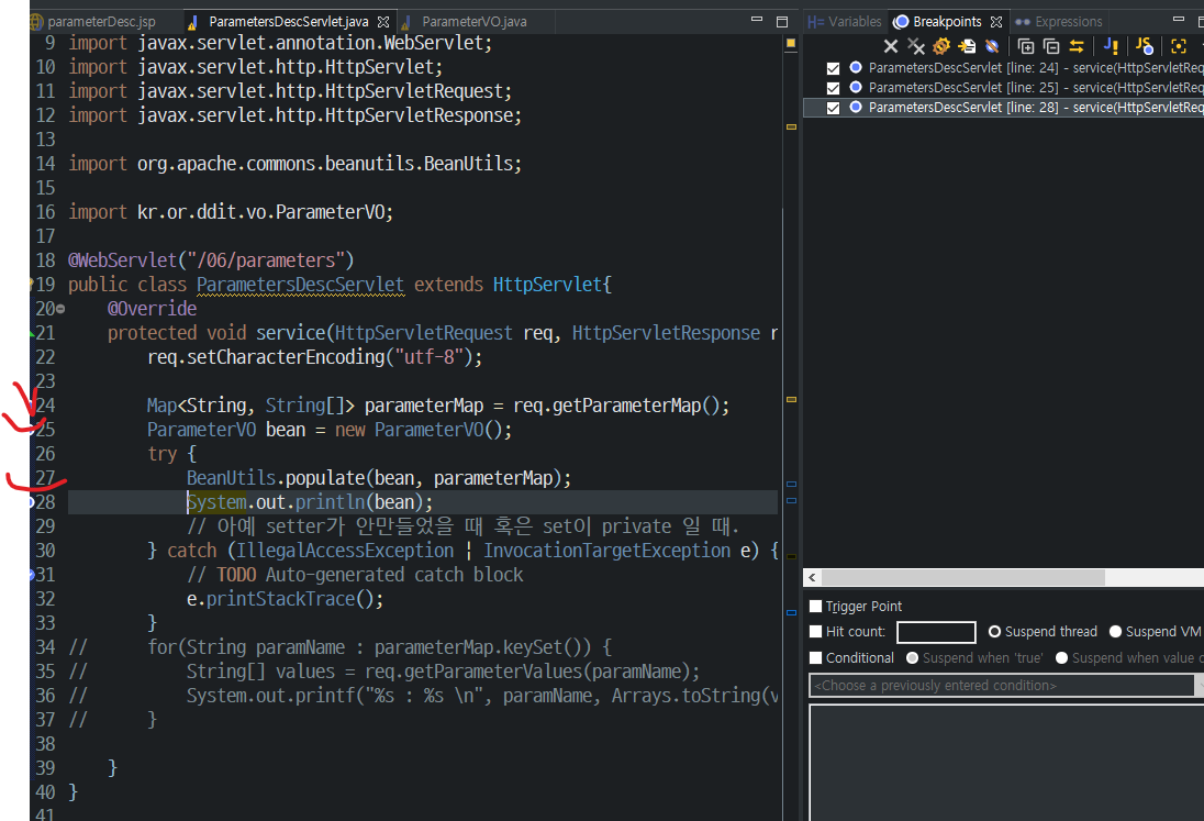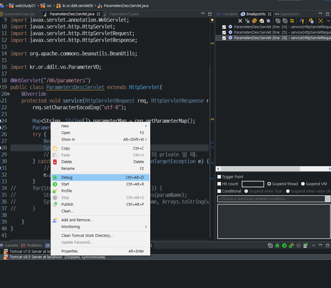 우선 디버그를 하기 전에 확인할 곳을 표시한다.